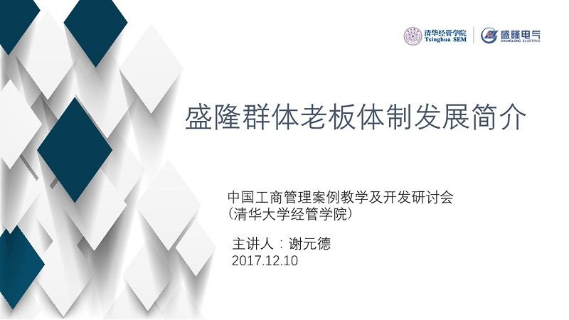 12月10日上午,“2017年冬季中国工商管理案例教学及开发研讨会”在清华大学经管学院伟伦楼举行。盛隆电气集团董事长谢元德受邀以《盛隆群体老板体制发展简介》为主题发表演讲。来自清华大学、复旦大学等全国各地高校近200名经管专业的教授、学者参加。