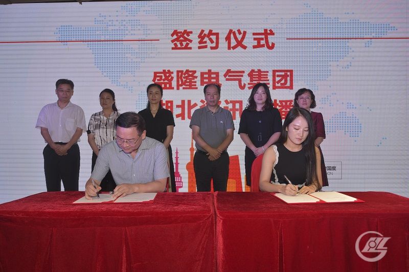 湖北广播电视台资讯广播总监张良武(左)与盛隆电气集团公共事务部部长白晶(右)在会上签约