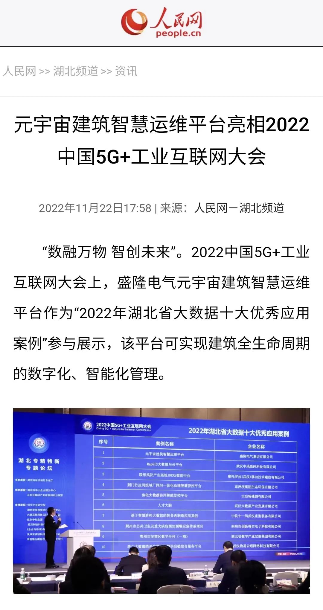 “数融万物 智创未来”。11月19日,2022中国5G+工业互联网大会在中国光谷科技会展中心盛大开幕。盛隆电气元宇宙建筑智慧运维平台作为“2022年湖北省大数据十大优秀应用案例”参与展示,自主研发的智能配电柜iPanel同时亮相此次展会。人民网、新华社、中新社、湖北日报、湖北电视台、湖北发布、长江云、长江日报、极目新闻...2022-11-24 -