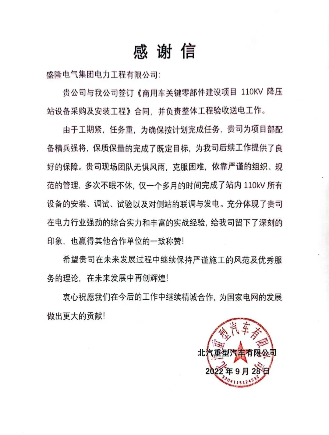 9月28日晚上8时8分,江苏省常州市新北区韶山路18号,北汽重型常州商用车110kV降压站项目内,所有人屏息以待。随着电力调度人员指令的发出,运行操作人员合上开关,降压站一次送电成功!仅用50天,盛隆电气克服工期短、难度大等困难提前通电,以强劲的综合实力、丰富的实战经验,赢得业主单位称赞。北汽重型汽车公司发来感谢...2023-03-10