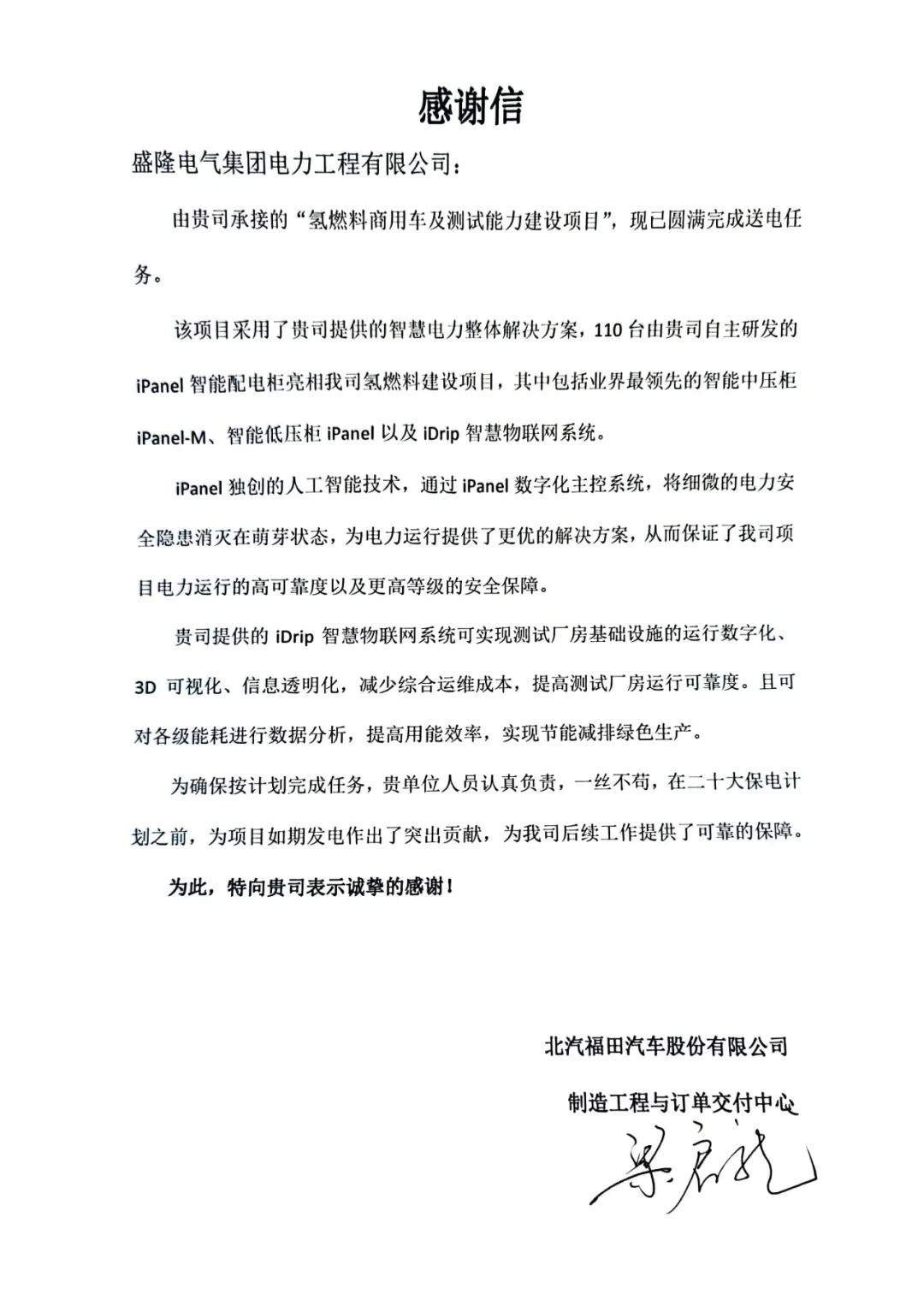 近日,北汽福田氢燃料建设项目顺利送电,盛隆电气为其提供个性化的智慧电力解决方案,并以“明星产品”iPanel智能配电柜和iDrip智慧物联网系统的亮眼表现,以及扎实的技术和优质的服务,获得了业主方、供电公司等单位的一致好评。业主方特别发来感谢信,对盛隆电气表示高度认可和赞誉,并表示,此次顺利送电,为其“二十大...2023-04-12 -