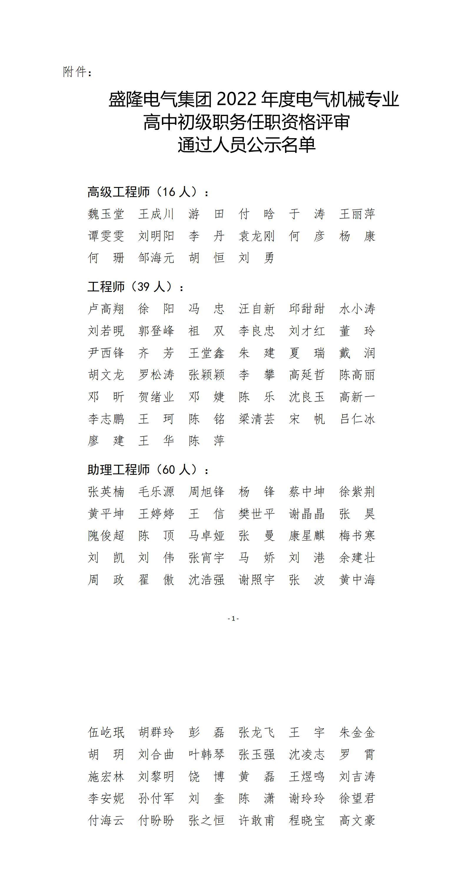 盛隆电气集团2022年度电气机械专业高中初级职务任职资格评审结果公示