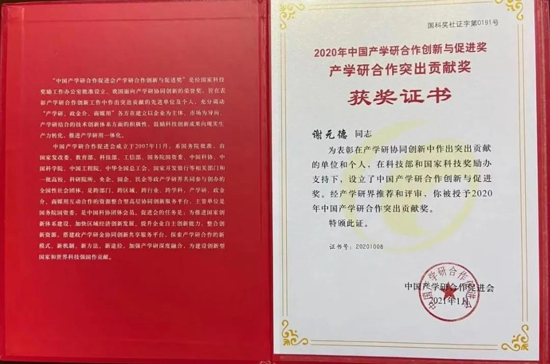 盛隆电气董事长谢元德荣获2020年中国产学研合作突出贡献奖